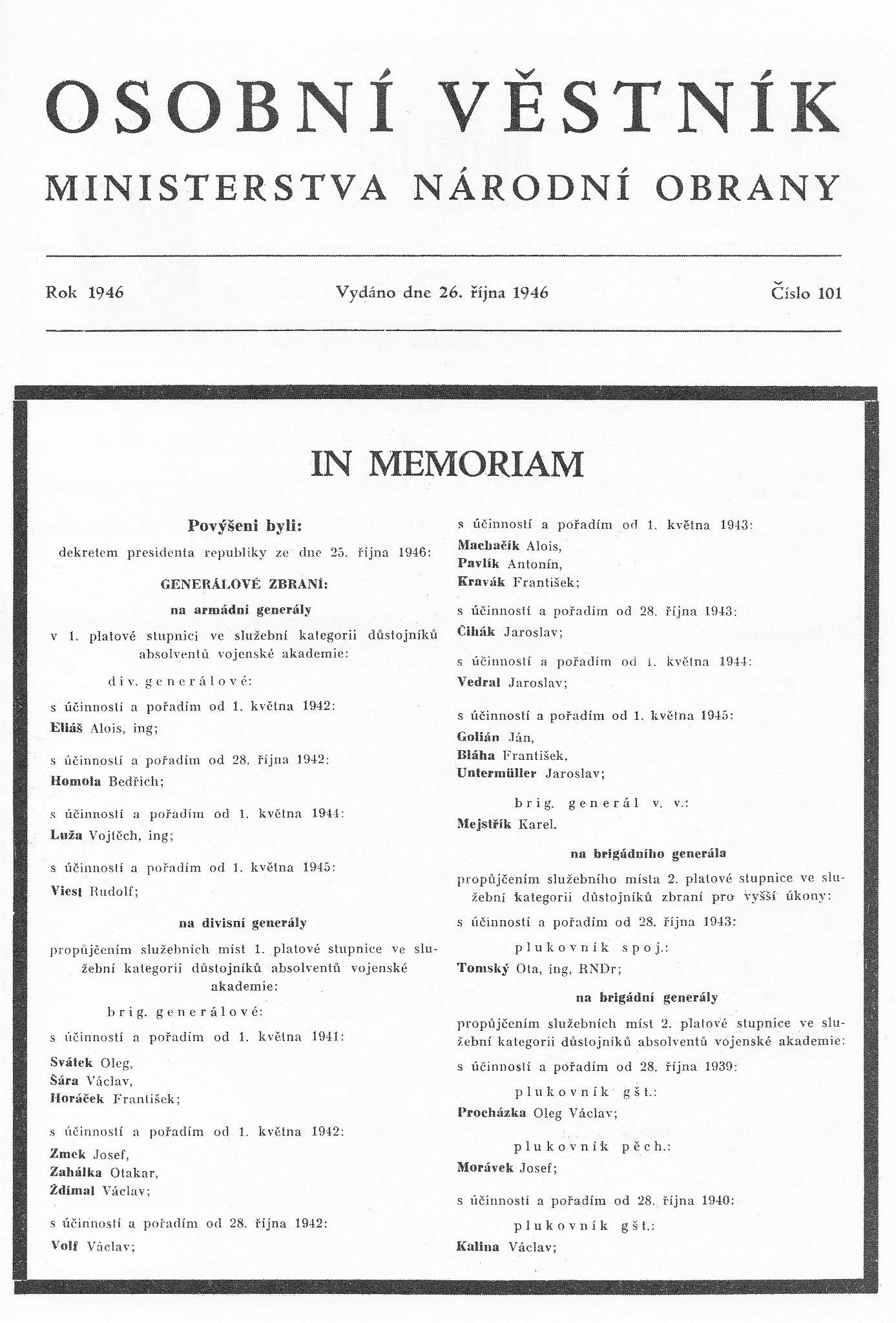 kopie titulní strany Osobního věstníku MNO č. 101 z roku 1946, jímž byli důstojníci povýšeni za své odbojové zásluhy do vyšších hodností (vlevo dole divizní generál Josef Zmek) zde